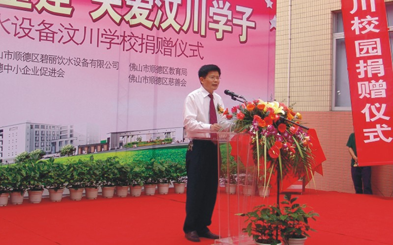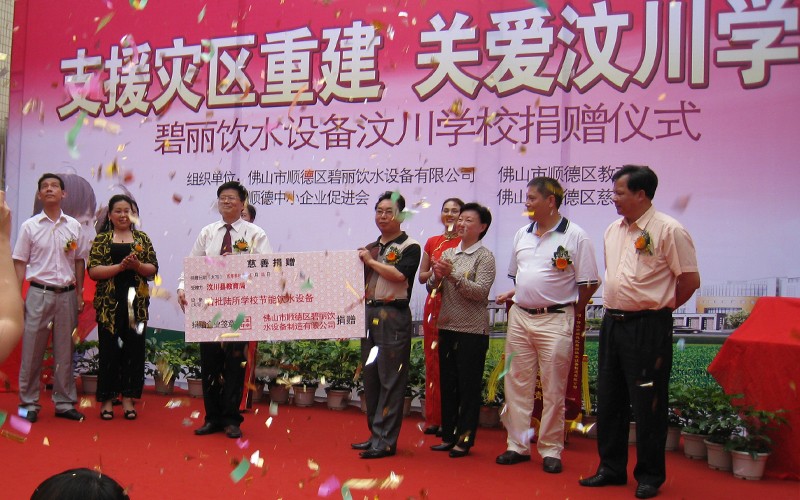 2009年4月,在汶川地震一周年之際,為了盡快幫助汶川受震災區重建家園,讓汶川的孩子們早日回到自己心愛的校園,讓孩子們喝上健康衛生的水,碧麗公司向汶川縣正在重建中的6所學校贈送節能王數碼高背板飲水機,為災區的重建出一份力量,“大愛無疆,情系汶川”,碧麗關愛汶川災區的孩子,為災區孩子送上健康水是碧麗人的心愿。