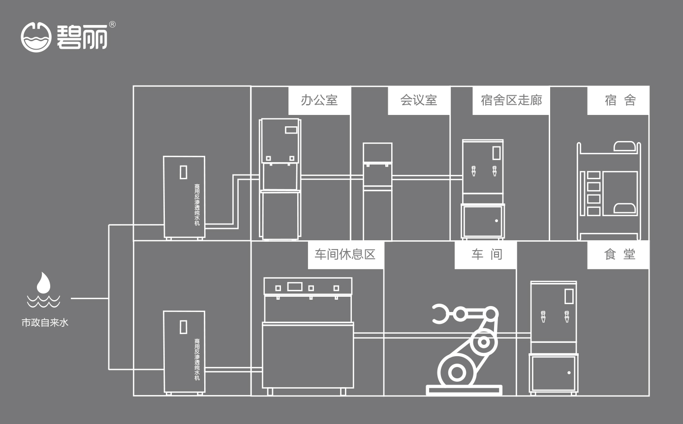 碧麗商用反滲透純水機(jī)將自來(lái)水集中處理后,把優(yōu)質(zhì)的純凈水通過(guò)專(zhuān)用的供水管道輸送到各飲水點(diǎn);