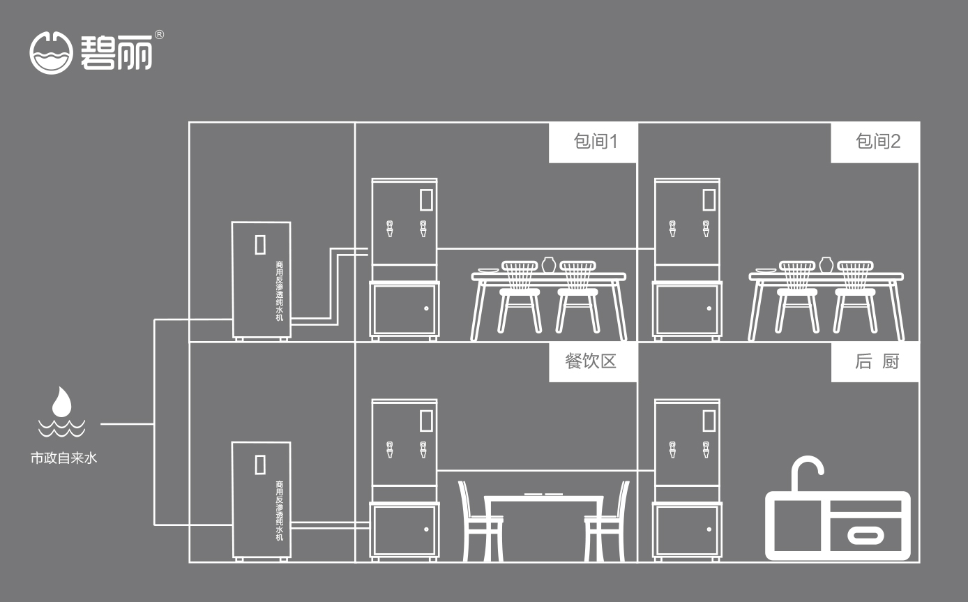 碧麗商用反滲透純水機將自來水集中處理后,把優質的純凈水通過專用的供水管道輸送到各飲水點;